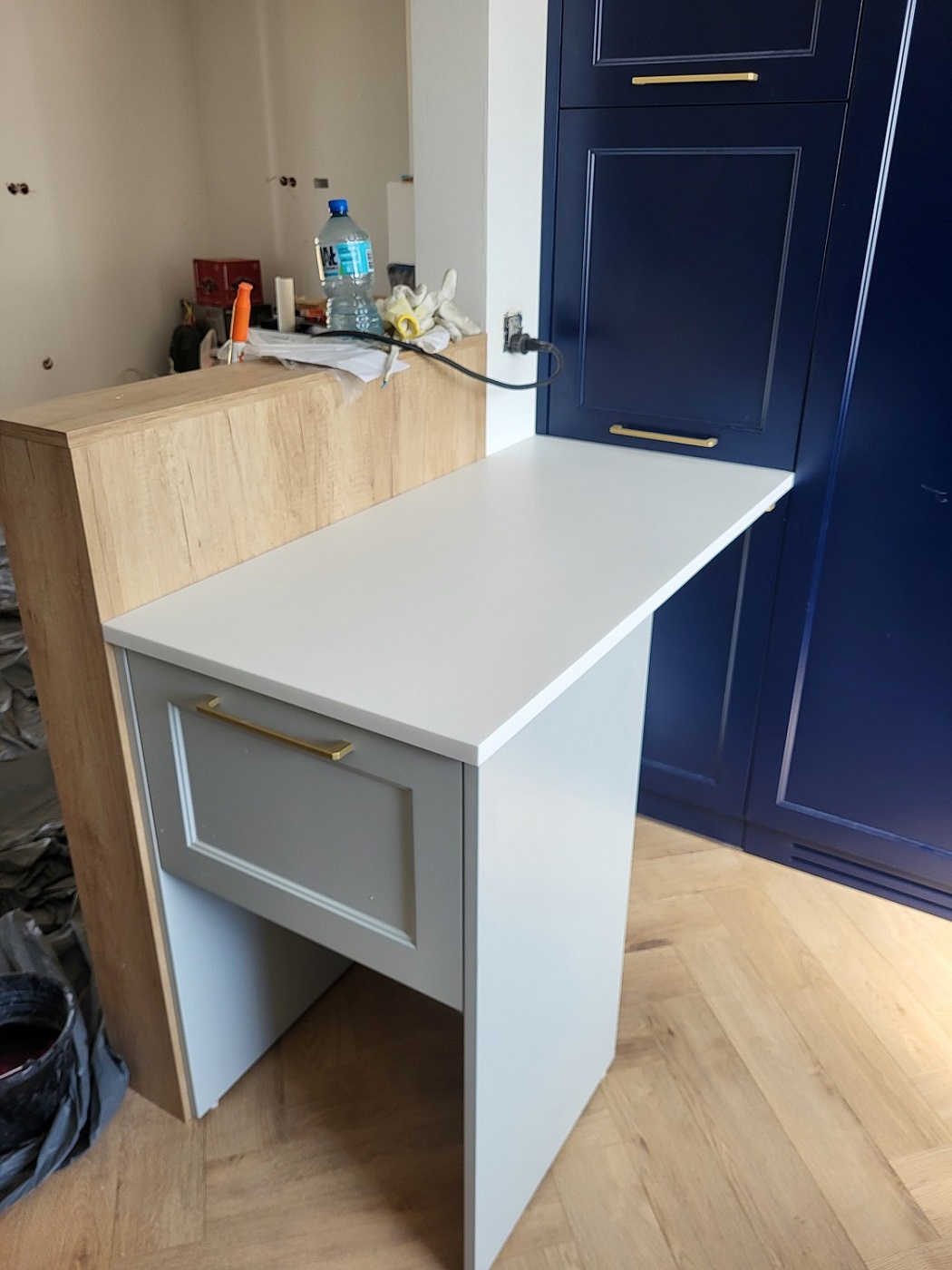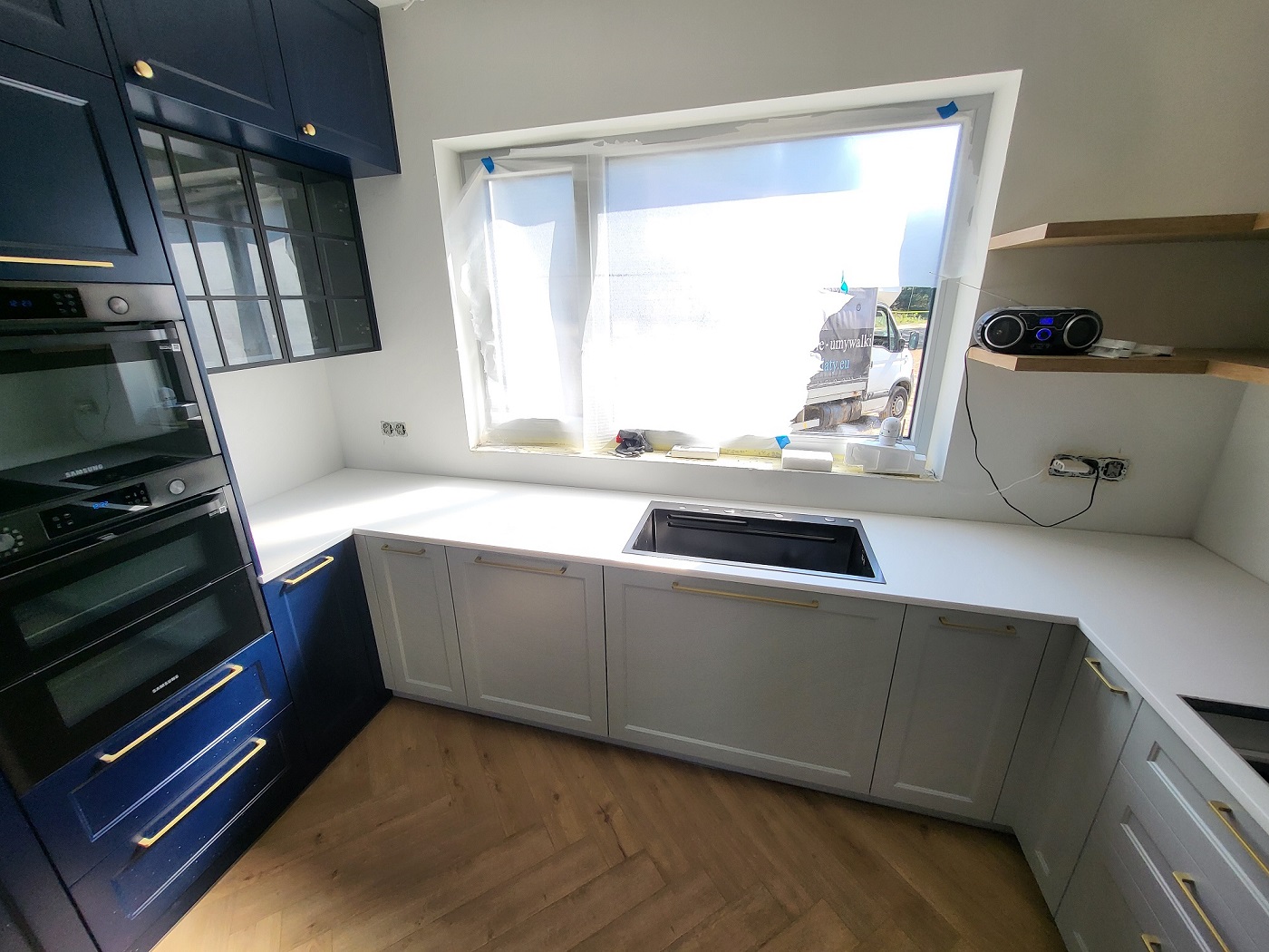 Dlatego w tej realizacji postawiliśmy na biały blat z solid surface z bezspoinowymi łączeniami. To rozwiązanie, które najbardziej docenisz wtedy, gdy kuchnia ma układ L albo U — czyli dokładnie tam, gdzie standardowe blaty zwykle „zdradzają”, że są składane z elementów.