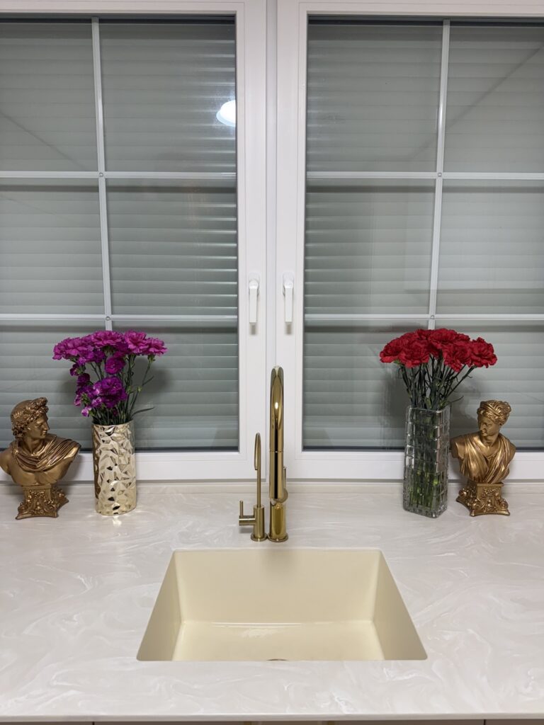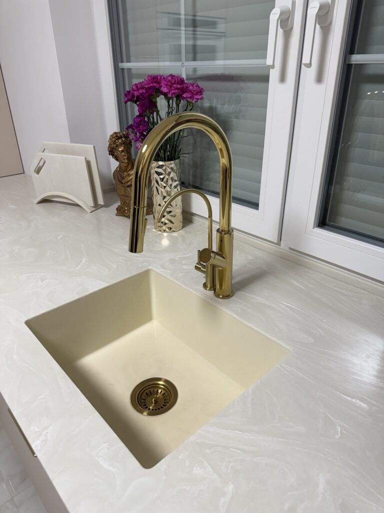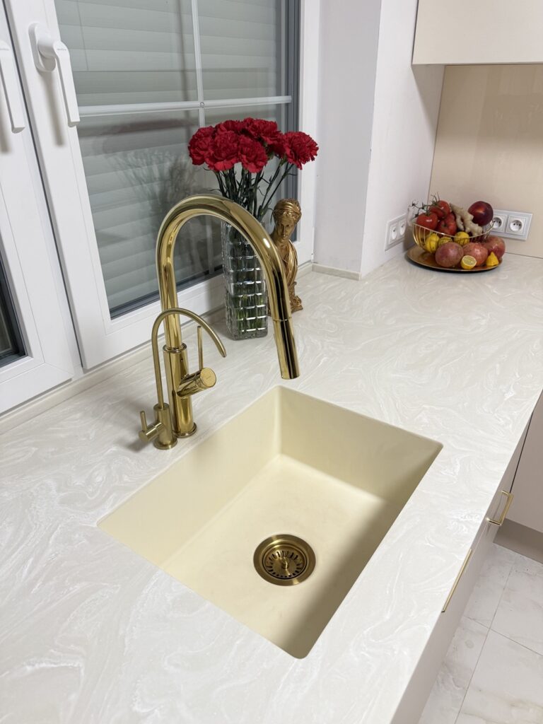 Blat kuchenny w kształcie L z Corian Nimbus Prima z bezspoinowym łączeniem i zintegrowanym zlewem French Vanilla