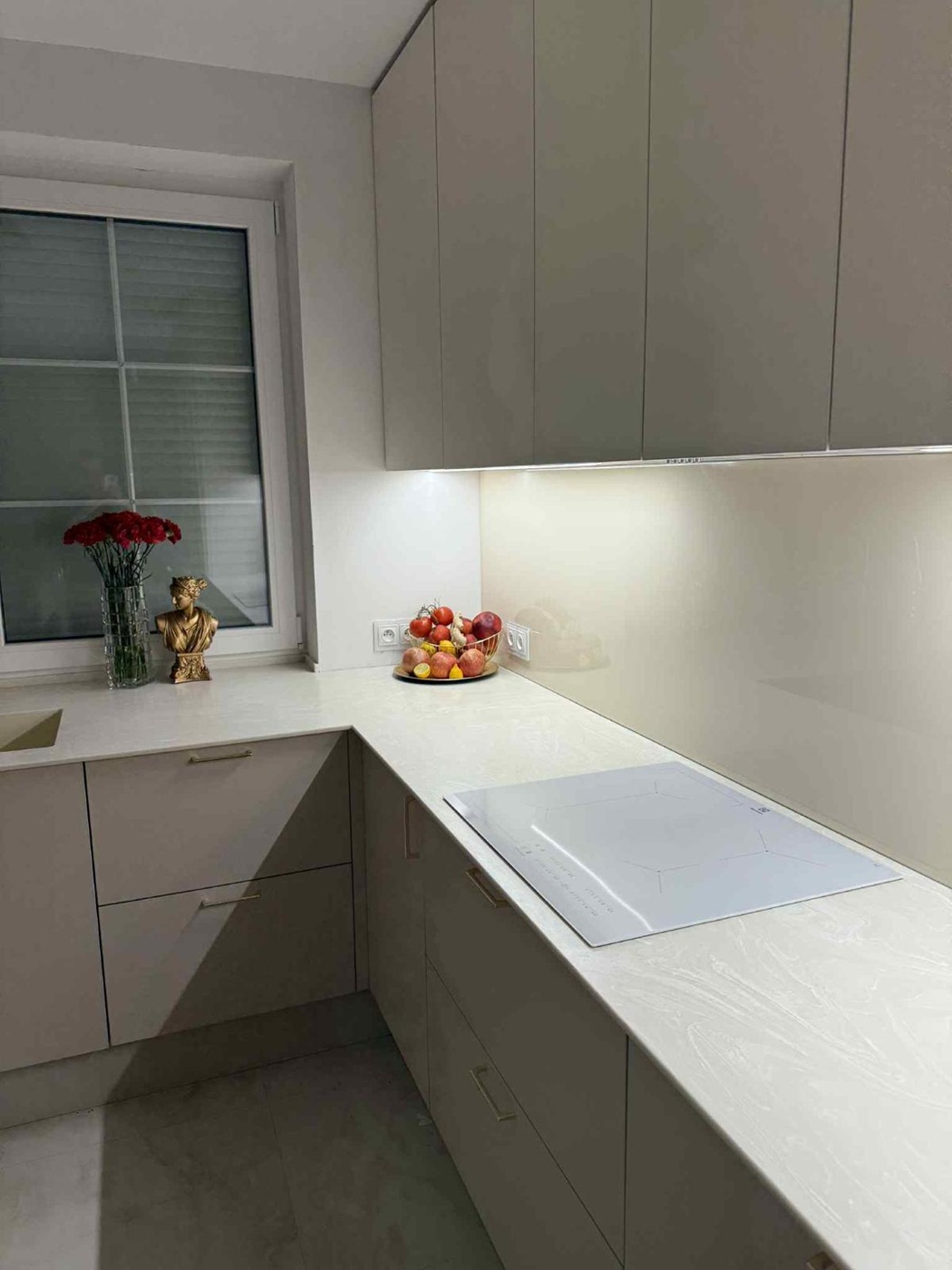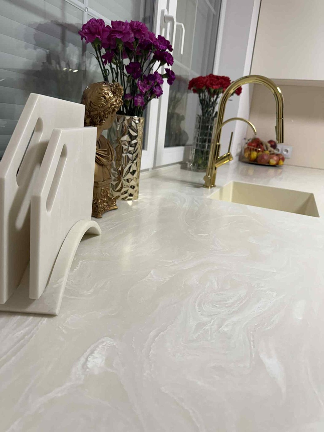 Blat kuchenny wykonany z materiału Corian Nimbus Prima, w kształcie litery L, z bezspoinowym łączeniem i zintegrowanym zlewem French Vanilla.