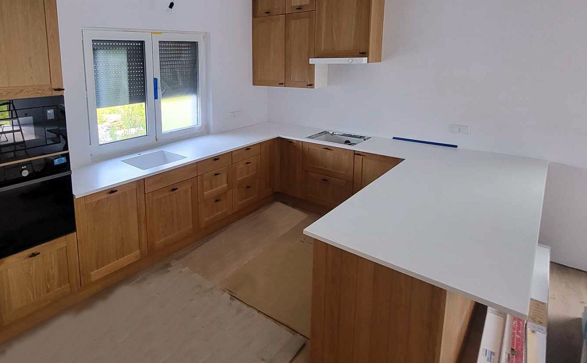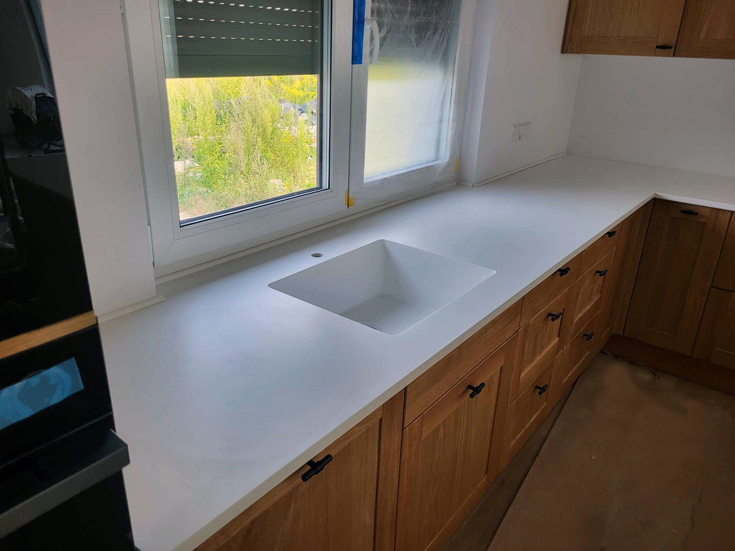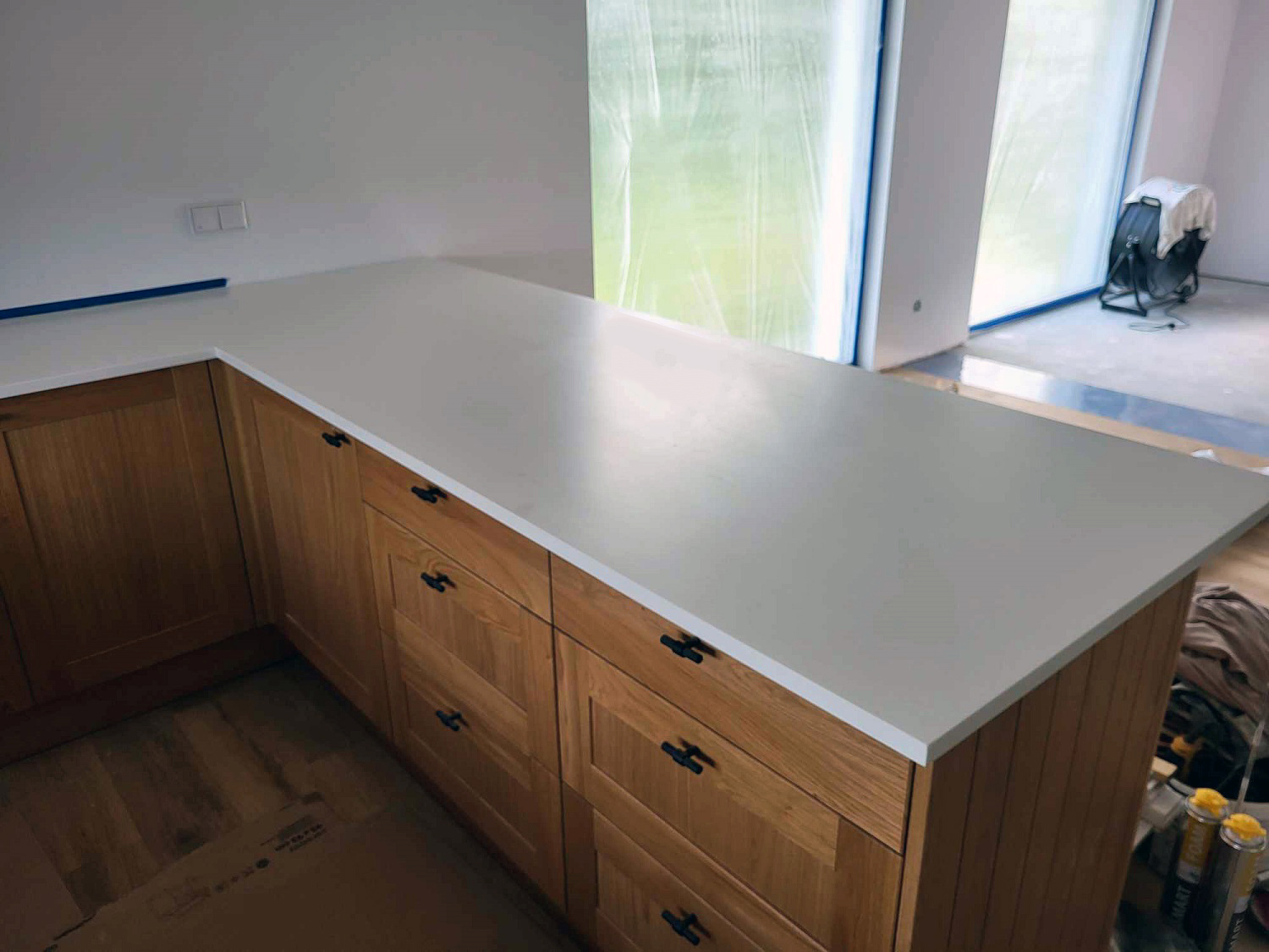 Jedna z najważniejszych zalet materiału solid surface to możliwość tworzenia dużych, jednolitych powierzchni. W tej realizacji blat został wykonany w układzie litery U, z precyzyjnym dopasowaniem w narożnikach i bez widocznych łączeń. Dzięki temu cała kuchnia wygląda jak spójna, odlana forma.