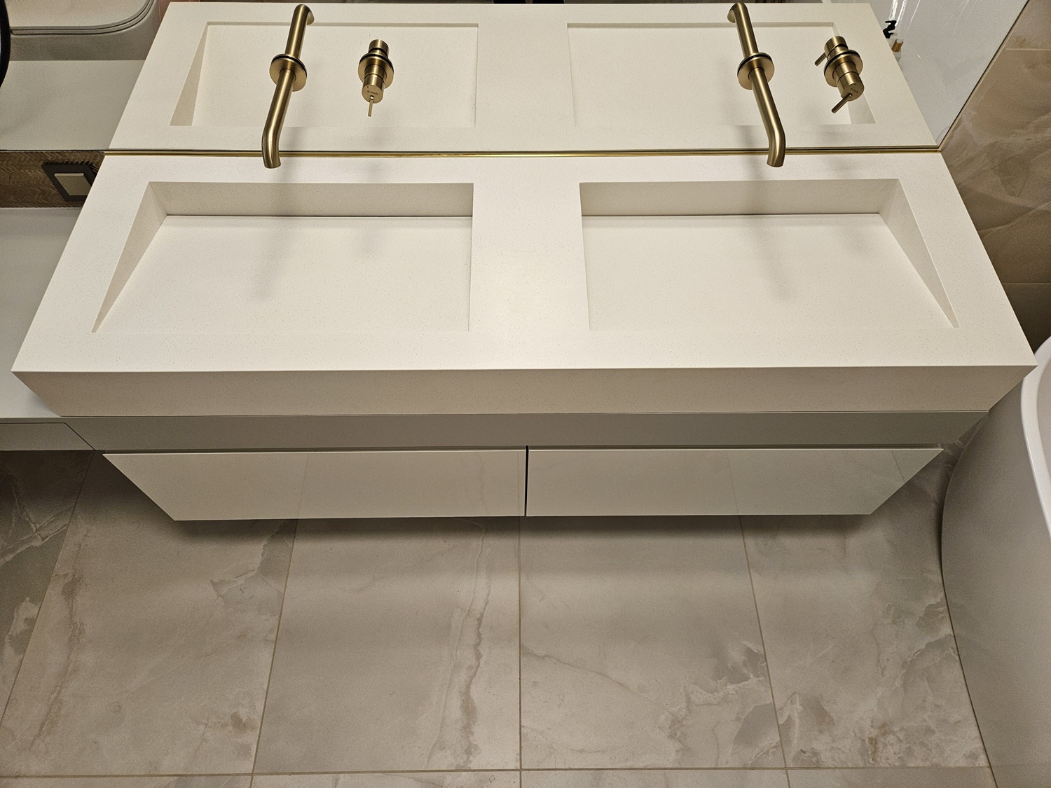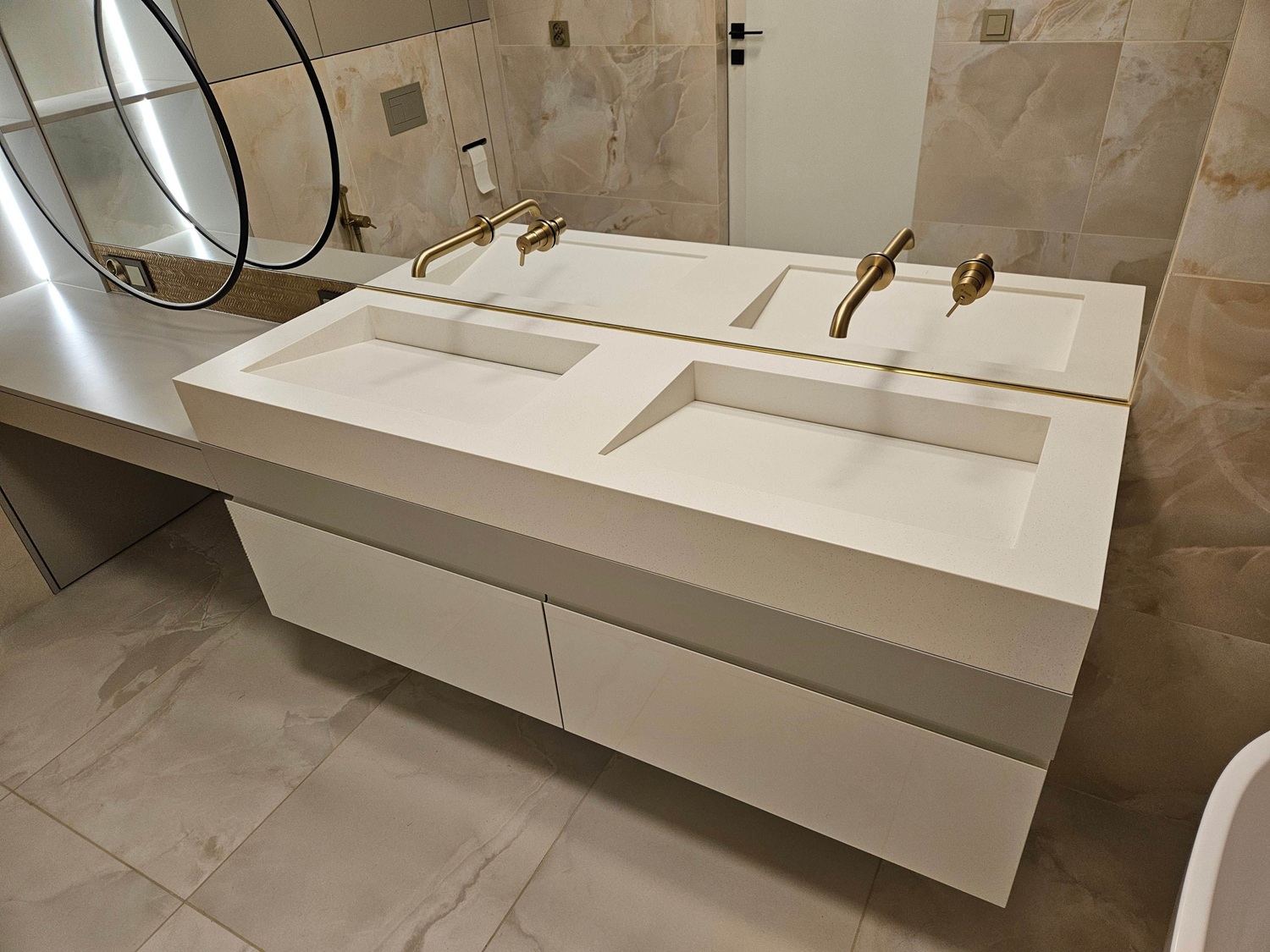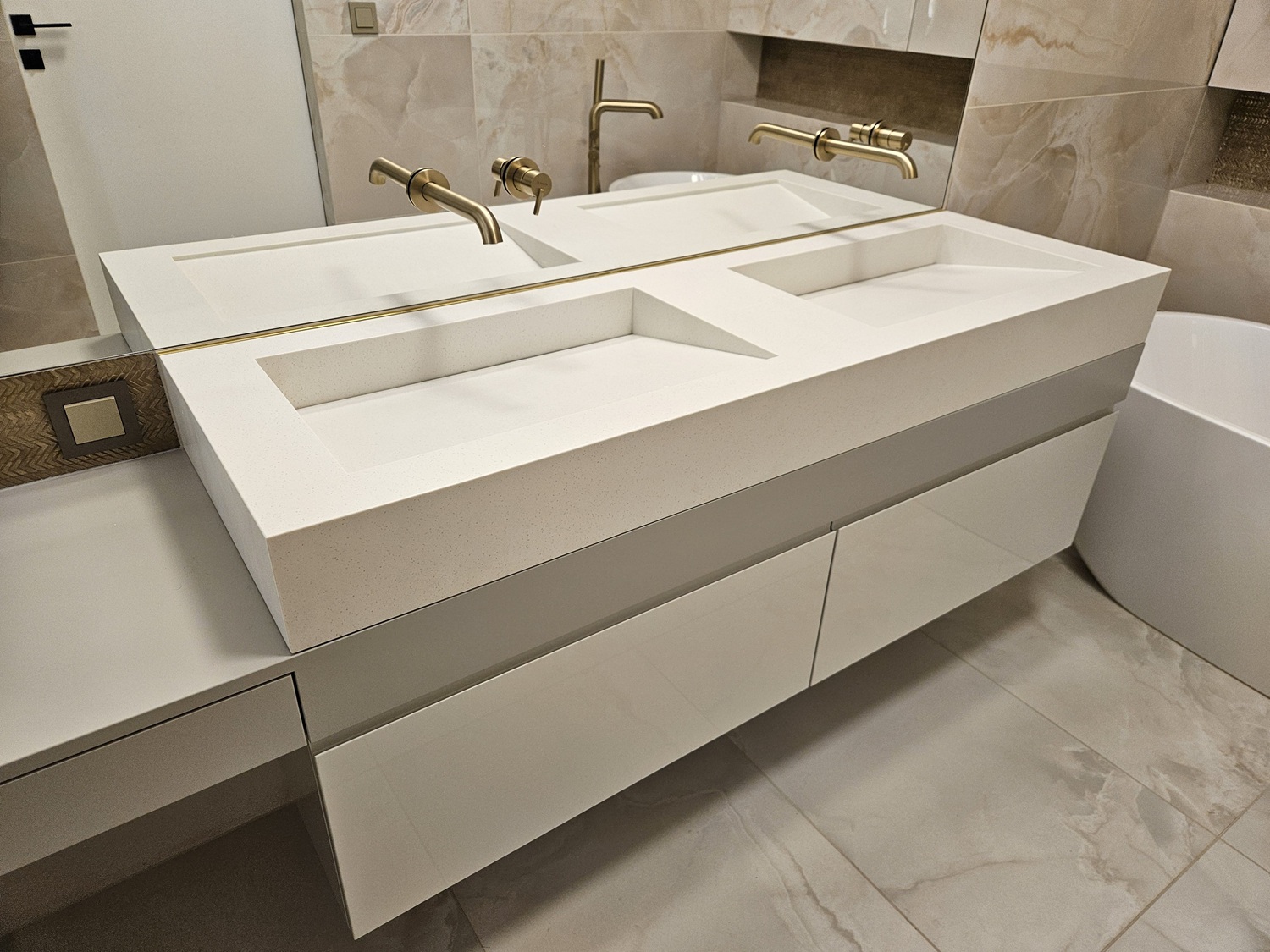 W tej realizacji postawiono na minimalistyczną elegancję i funkcjonalność. Blat łazienkowy z podwójną, zintegrowaną umywalką został wykonany z solid surface Grandex D315 Spacemen Food – materiału cenionego za trwałość, higienę i możliwość regeneracji.