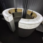 Projekt wykonany został w całości z materiału solid surface w połączeniu z dekoracyjnym, półtransparentnym Hi-Macs Pavia. Delikatne podświetlenie podkreśla strukturę materiału i nadaje całości wyjątkowego charakteru.