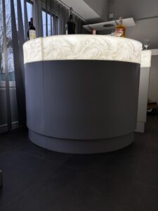 Szampański klimat zamknięty w formie – lada z solid surface i Hi-Macs Pavia