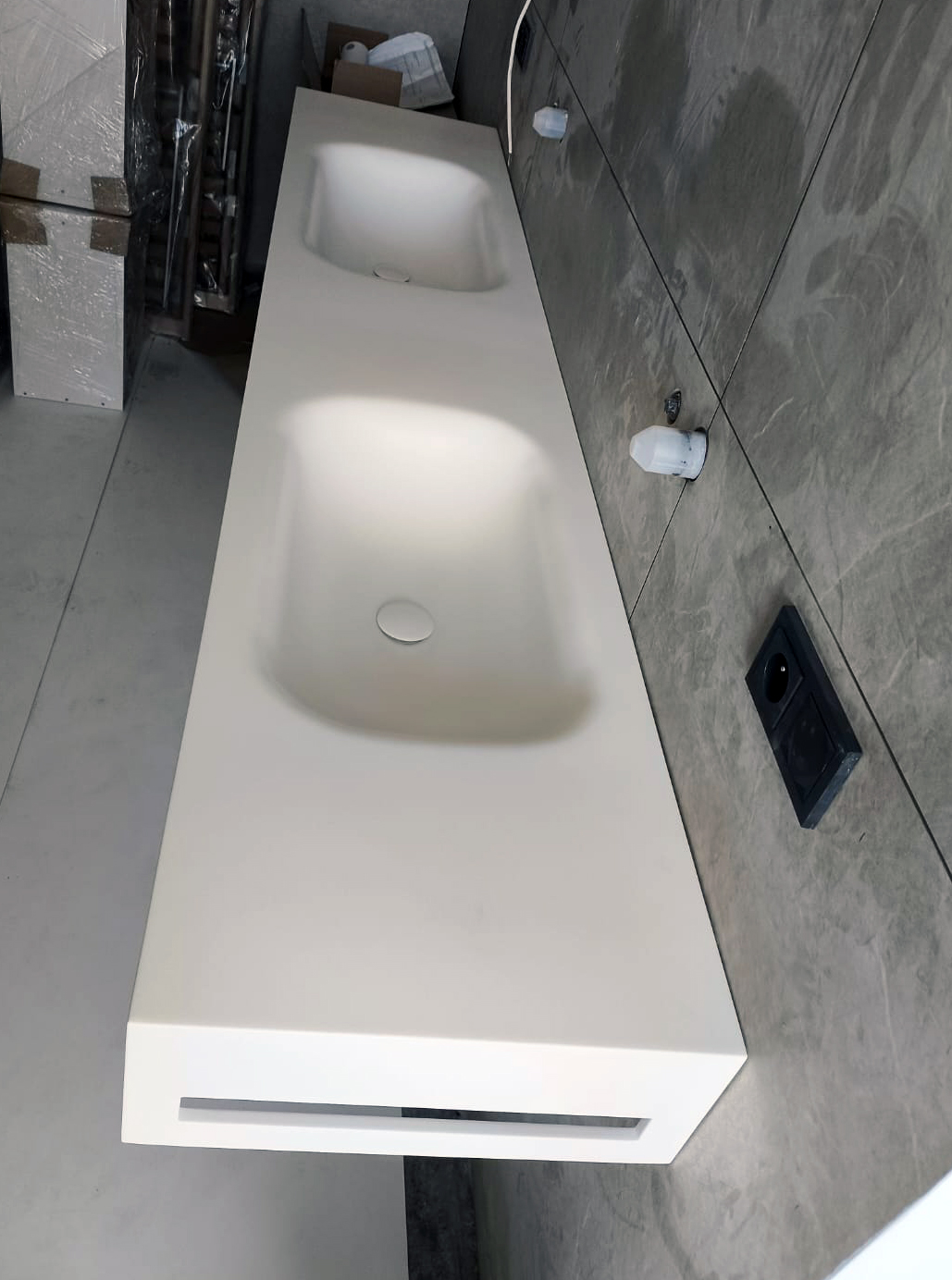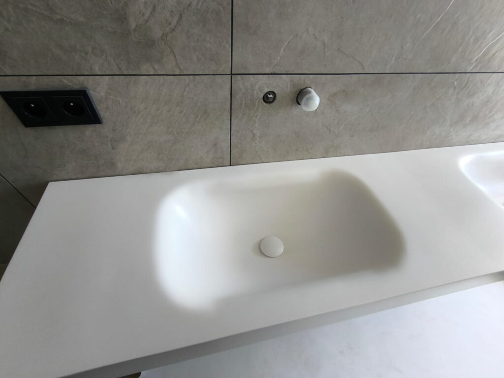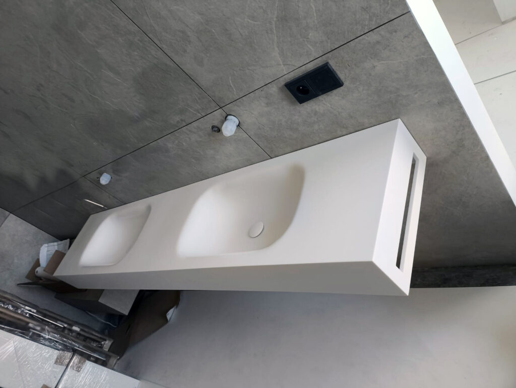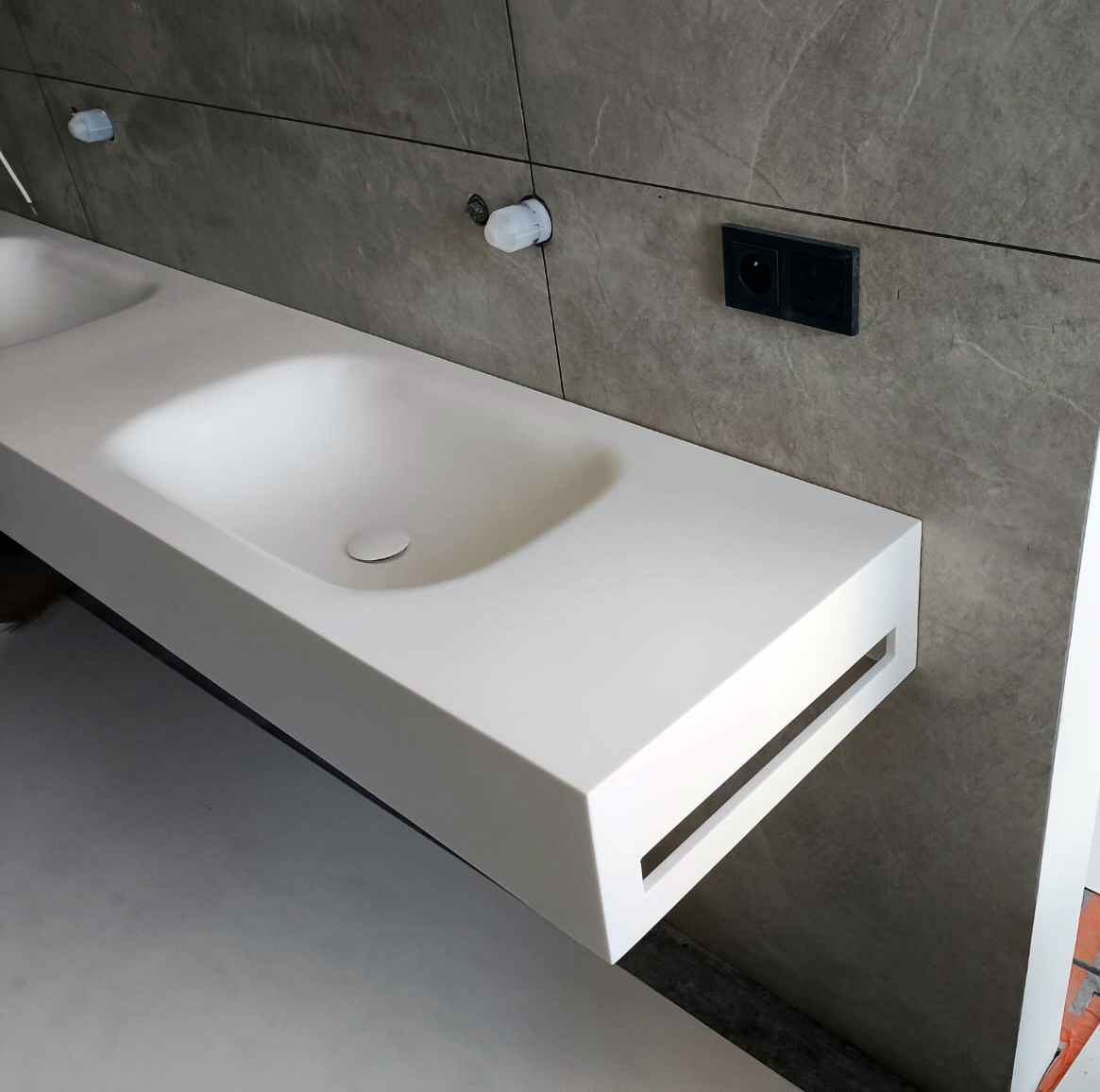 Zintegrowana forma z materiału solid surface oraz wyfrezowane otwory na ręczniki po bokach czynią ją praktycznym i stylowym elementem wnętrza.